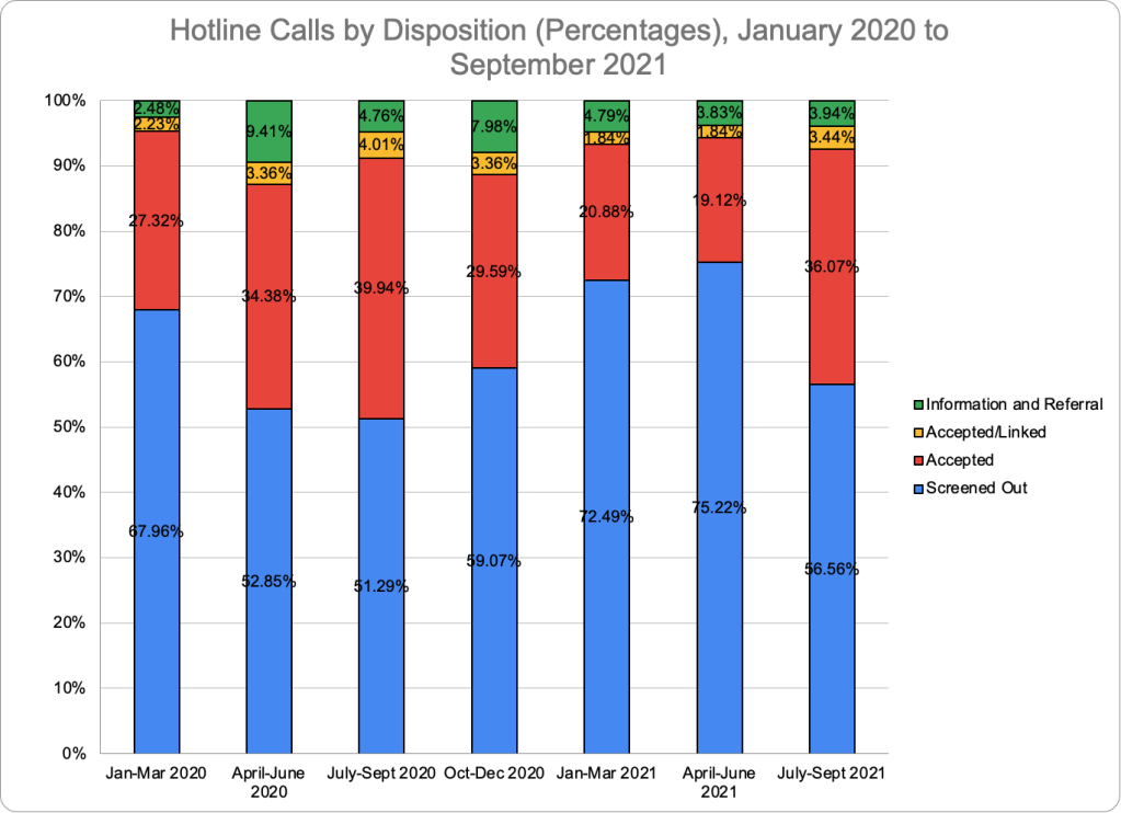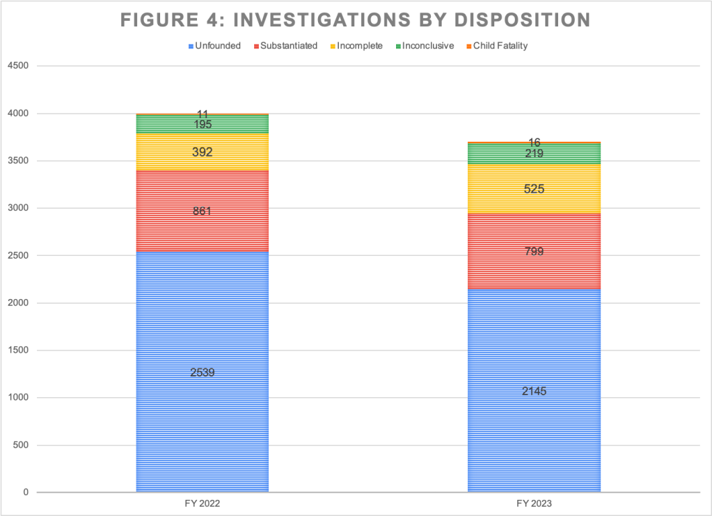 *While the number of referrals accepted for investigation was 3,902 in FY2023 according to the Dashboard’s Hotline Calls by Referral Type graphic, the total number of investigations displayed in the Investigations by Disposition graphic was 3,704. The reason for the difference is unclear. According to the Dashboard, “accepted for investigation” means that “the hotline call resulted in a new investigation being opened on the family.” So the two numbers should be the same.
