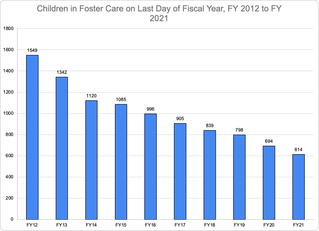 Looking at the data for Fiscal Year 2021 in total, there were 251 entries into foster care and 327 exits in the four quarters ending on October 30, 2021. With exits eclipsing entries, the number of children in foster care should have fallen by approximately 76 children. And indeed, Table One above shows that the total number of children in foster care fell by 80 from 694 in September 2020 to 614 in September 2021.** This was a decrease of 11.5 percent, somewhat less than the 13.0 percent decrease between FY 2019 and FY 2020. The foster care rolls have been falling annually for years, but the decrease accelerated in Fiscal Year 2020, as shown in Figure Thirteen,*** and only slightly decelerated in FY 2021. When asked about the drop in the foster care rolls a year ago, CFSA responded that it reflects the agency’s continued commitment to keep families together without formal child welfare involvement when it is safe to do so.
