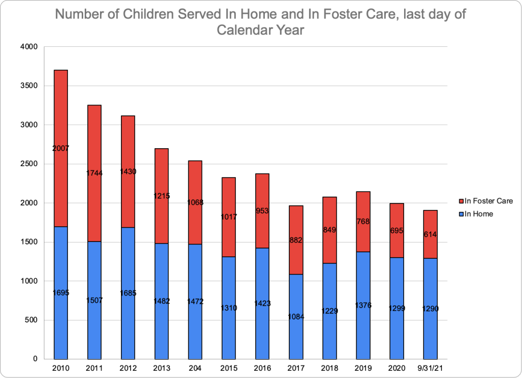 Table One shows that the total number of children being served in their homes was 1,290 on September 30, 2021, very slightly down from 1299 on September 30, 2020. That is not surprising, since the difference between entries to (119) and exits from in-home services (134) was very small as well.**