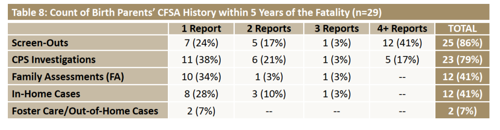 Nine of the 40 families reviewed in the report (or about 23 percent) were involved with CFSA at the time of the fatality. Of these nine families, five had an open foster care case, two had an open investigation, one had an open in-home case and an open investigation, and one had an open permanency case and an open CPS investigation. Obviously it is concerning that these fatalities could occur while CFSA was actively involved with the family. One has to wonder whether any red flags were disregarded. But without knowing the details of CFSA’s involvement with these families, it is impossible for readers of this report to make any conclusions about agency practice.
