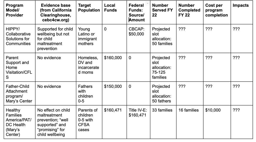 The expansion into primary prevention through creation of the Family Success Centers is a prime example of this desire to broaden CFSA’s mission when the agency struggles to perform its core responsibilities adequately. Prevention of child maltreatment is not in the original mandate of child welfare agencies, and for good reason. If anything, child maltreatment prevention is normally conceptualized as a public health function, which is why home visiting programs are generally provided by health departments. More and more jurisdictions, including our neighbors in Maryland and specifically Baltimore, are investing in Family Connects, which provides a hospital visit from a nurse to every newborn to assess risk and refer to appropriate services. Family Connects has been shown by randomized controlled trials to reduce emergency room visits and hospital stays by 50% in the first year of life and CPS investigations by 44% in the first two years of life. The jurisdictions that have adopted Family Connects understand that neighborhood family support centers will never reach the most at-risk children, whose parents are too mentally ill, impaired by drugs, or overwhelmed to recognize that they need help.